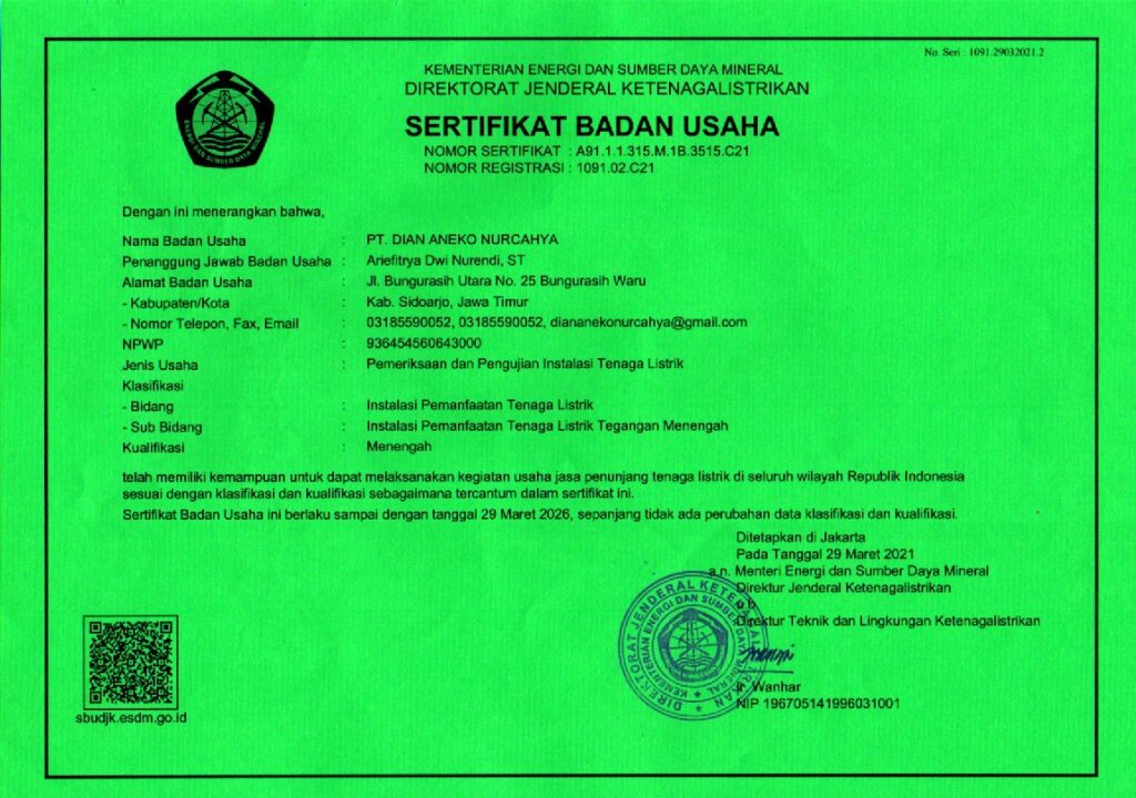 PT. DIAN ANEKO NURCAHYA ( PT. DAN ) memiliki Ijin Usaha dan Operasional secara resmi dan Profesional untuk melakukan Inspeksi , Pemeriksaan dan Pengujian Instalasi Pemanfaatan Tenaga Listrik Tegangan Menengah ( TM ) guna pemenuhan Sertifikat Laik Operasi ( SLO ) berdasarkan Sertifikat Badan Usaha kami nomer registrasi : 1091.02.C21 yang diterbitkan oleh Dirjen Ketenagalistrikan Kementerian ESDM Republik Indonesia tanggal 29 Maret 2021.