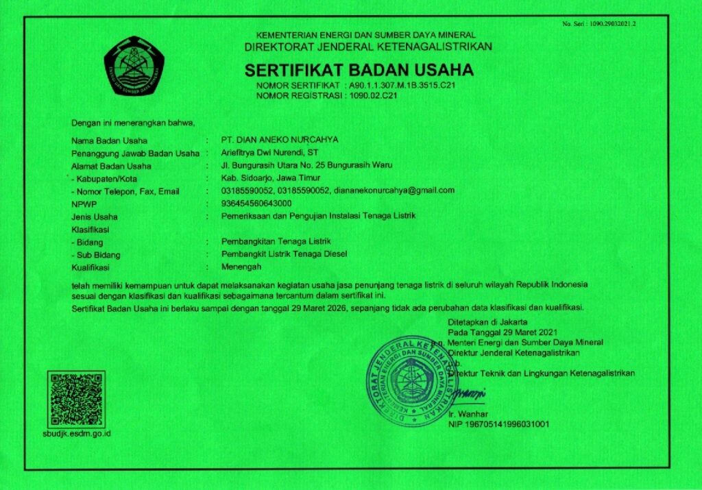 PT. DAN juga memiliki Ijin Usaha dan Operasional secara resmi dan Profesional untuk melakukan Inspeksi , Pemeriksaan dan Pengujian Instalasi Pemanfaatan Pembangkit Listrik Tenaga Diesel ( PLTD / GENSET ) guna pemenuhan Sertifikat Laik Operasi ( SLO ) berdasarkan Sertifikat Badan Usaha kami nomer registrasi : 1090.02.C21 yang diterbitkan oleh Dirjen Ketenagalistrikan Kementerian ESDM Republik Indonesia tanggal 29 Maret 2021.
